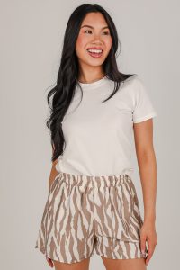 A fierce look like the Fierce Frequency Mocha Zebra Print Shorts will certainly drive everyone wild for your style! Featuring a trendy zebra print in warm mocha tones, these shorts are designed with a stretchy elastic waistband for an easy, relaxed fit. The lightweight fabric keeps things breezy, while the eye-catching print adds a fun, fashion-forward edge. Pair them with a simple tank or matching top for a standout look that’s perfect for casual days, vacations, or lounging in style! Lightweight Woven Knit Fabrication Zebra Print High-Waisted Elastic Waistband Relaxed Fit Split Hems Side Pockets Made in the USA 90% Rayon, 10% Nylon Machine Wash Cold, Lay Flat to Dry Model is 5’4″ and wearing a Small.Garment Measurements in Inches:Small | Waist 26ā (Stretches up to 32″) | Hips 42ā | Length 14.5ā | Inseam 3āMedium | Waist 28ā (Stretches up to 34″) | Hips 44ā | Length 15ā | Inseam 3āLarge | Waist 30ā (Stretches up to 36″) | Hips 46ā | Length 16ā | Inseam 3ā