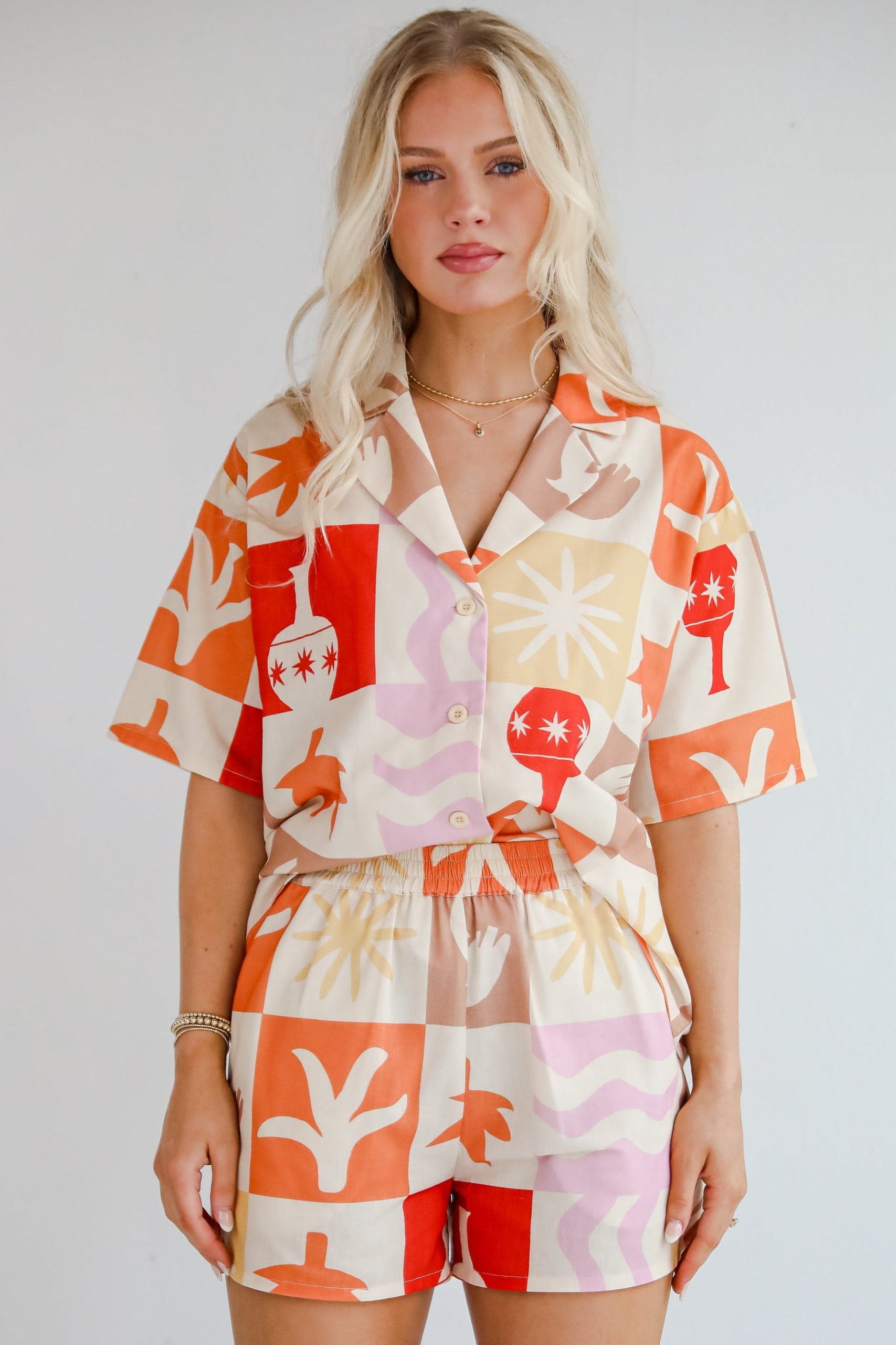 Get that tropical feeling every time you wear the Island Style Ivory Shorts! Featuring a lively tropical print in warm sunset hues, these lightweight shorts are perfect for beach days, brunch dates, and everything in between. The soft, breathable fabric and elastic waistband keep things comfy, while the playful silhouette adds just the right amount of flair. Pair them with a simple tank or the matching top for an effortlessly coordinated, island-ready look! Lightweight Cotton-Blend Fabrication Tropical Print High-Waisted Elastic Waistband Relaxed Fit Side Pockets 85% Polyester, 15% Cotton Hand Wash Cold, Lay Flat to Dry Model is 5’6″ and wearing a Small.Garment Measurements in Inches:Small | Waist 26ā€ (Stretches up to 32″) | Hips 36ā€ | Length 14ā€ | Inseam 2.5ā€Medium | Waist 28ā€ (Stretches up to 34″) | Hips 38ā€ | Length 14.5ā€ | Inseam 2.5ā€Large | Waist 30ā€ (Stretches up to 36″) | Hips 40ā€ | Length 15ā€ | Inseam 2.5ā€