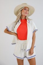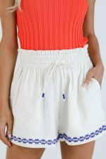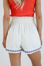 You’ll always create a sweet impression when you step out onto the sand in the Mykonos Memories Ivory Shorts! These high-waisted favorites feature a flattering paperbag silhouette with a cinched waistband and adjustable tie for the perfect fit. The subtle blue stitching adds a unique, eye-catching detail that sets them apart from your everyday shorts. Pair them with a tucked-in tank or breezy blouse for an effortlessly polished look thatās both playful and chic! Lightweight Cotton Fabrication Blue Stitching Accents High-Waisted Elastic Paperbag Waistband with Functional Drawstring Tie Relaxed Fit Side Pockets Fully Lined Self + Lining: 100% Cotton Hand Wash Cold, Lay Flat to Dry Model is 5’6″ and wearing a Small.Garment Measurements in Inches:Small | Waist 28ā (Stretches up to 34″) | Hips 36ā | Length 14ā | Inseam 3āMedium | Waist 30ā (Stretches up to 36″) | Hips 38ā | Length 14.5ā | Inseam 3āLarge | Waist 32ā (Stretches up to 38″) | Hips 40ā | Length 15ā | Inseam 3ā